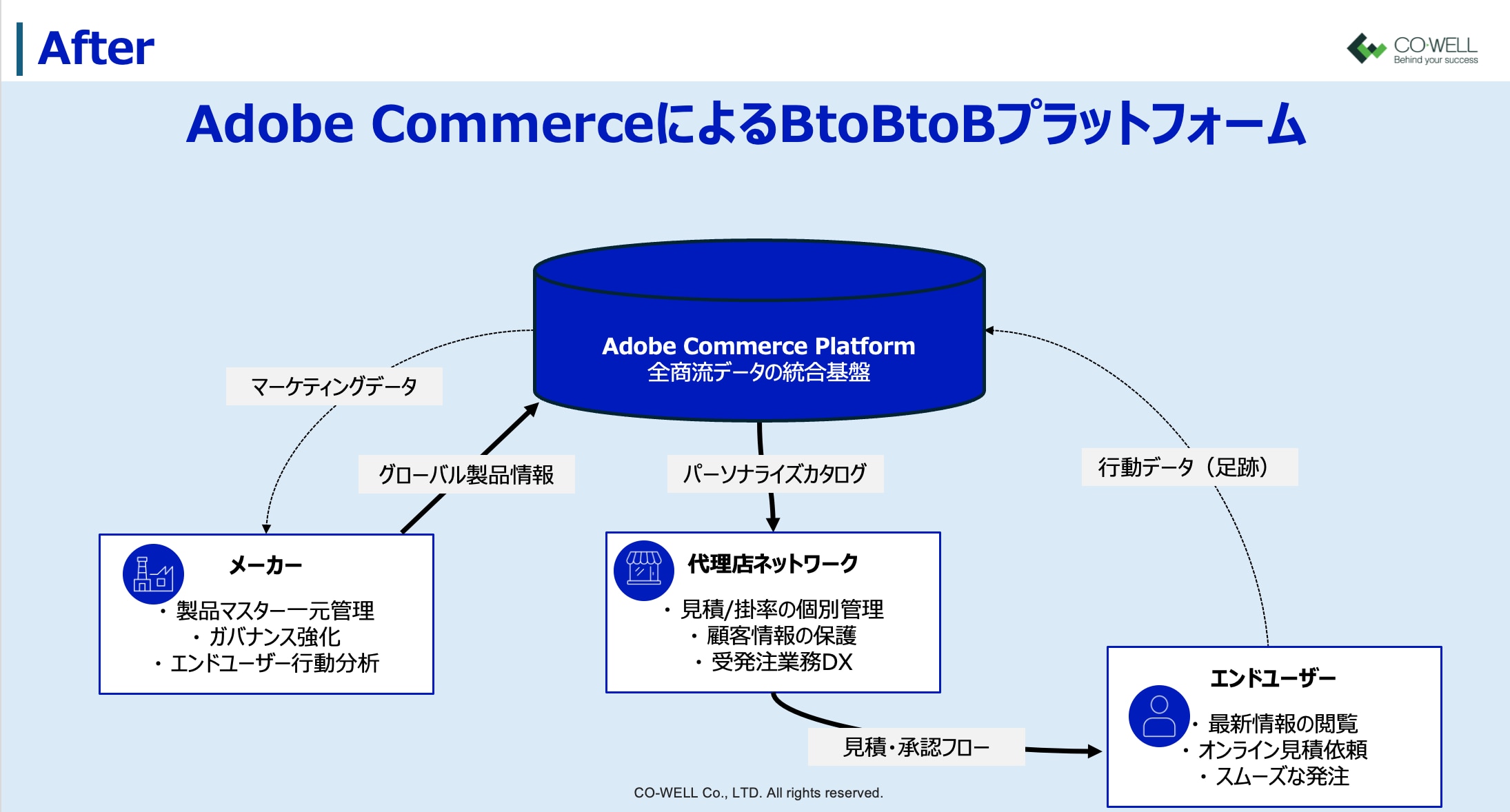 本プロジェクトにおいて最大の挑戦は、メーカー・代理店・エンドユーザーの三者が、それぞれにメリットを感じられる「三方良し」のプラットフォームを構築することでした。Adobe Commerceの高度なB2B機能をフル活用し、以下の3点を軸に設計を推進しました。